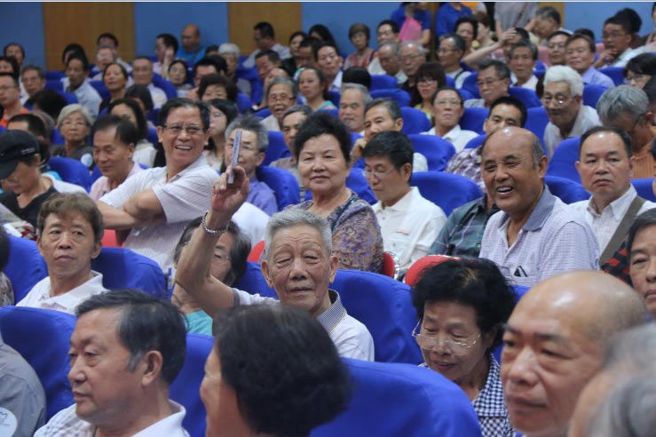 讲座现场发言踊跃 七旬老伯举高手臂等待发言