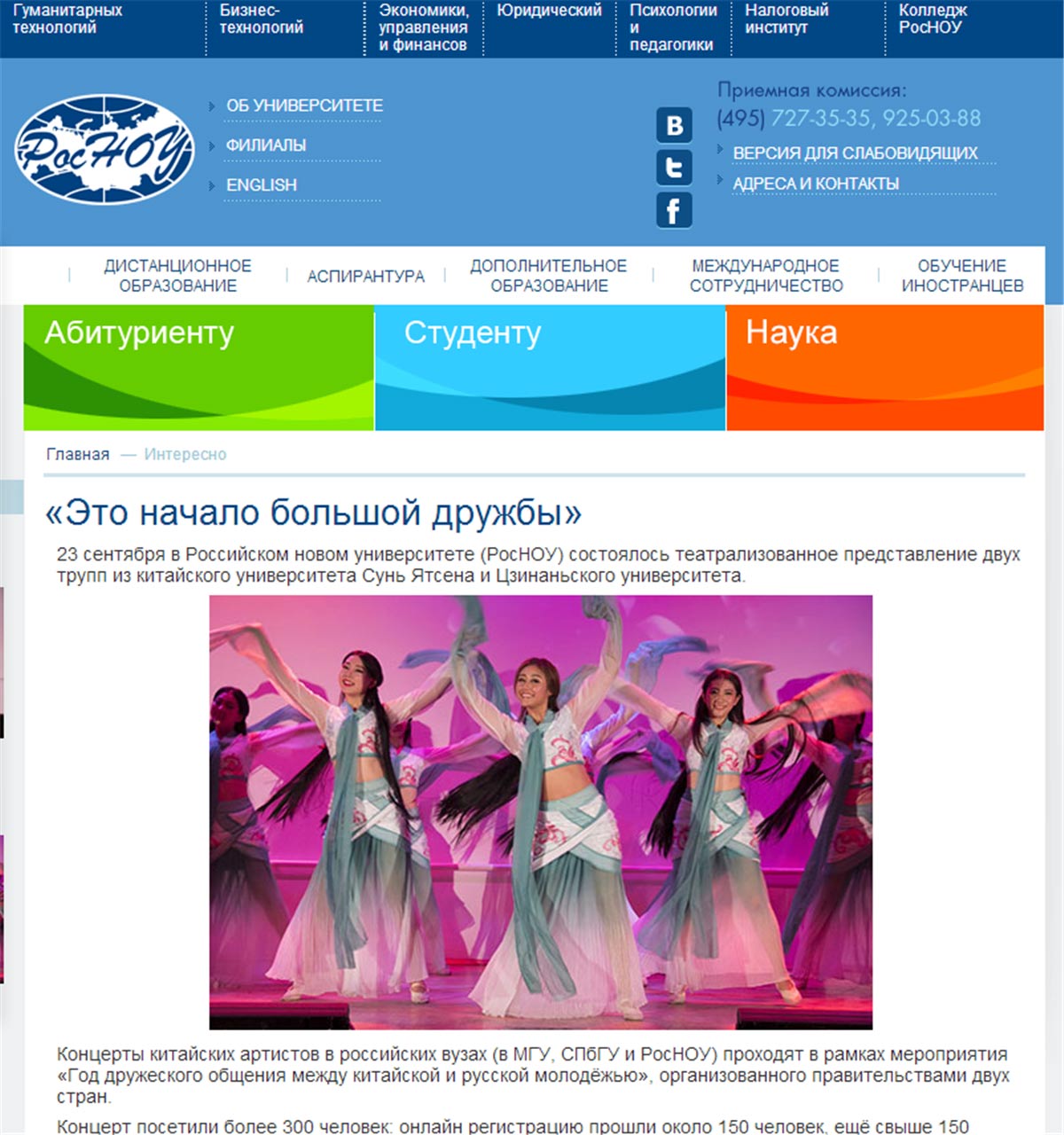 9月21日至28日,应俄罗斯姐妹大学邀请,暨南大学学生艺术团及武术队师生组成一支高水平艺术团组,与中山大学一同赴俄罗斯的莫斯科大学、俄罗斯新大学及圣彼得堡大学等三所着名高校进行为期8天的文化交流访问,为俄罗斯大学的师生们献上了别具特色的中华文艺表演。?