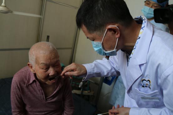 胡主任检查何奶奶牙齿后,向魏阿姨介绍,婆婆上颌牙齿缺失4颗,有6颗残根,下颌3颗牙齿松动,2个残根。胡主任建议尽量带婆婆来院免费检查,做进一步的治疗。