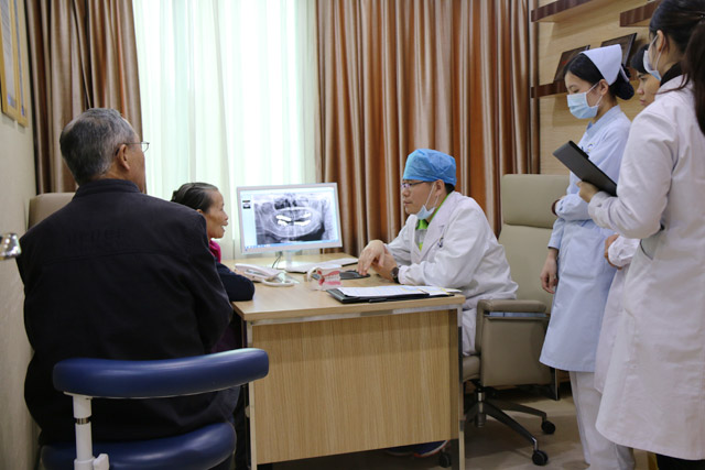 穗华口腔医院资深种植科专家赵清桐博士,擅长口腔种植修复等。现场中,他对口腔患者进行口腔方案设计。